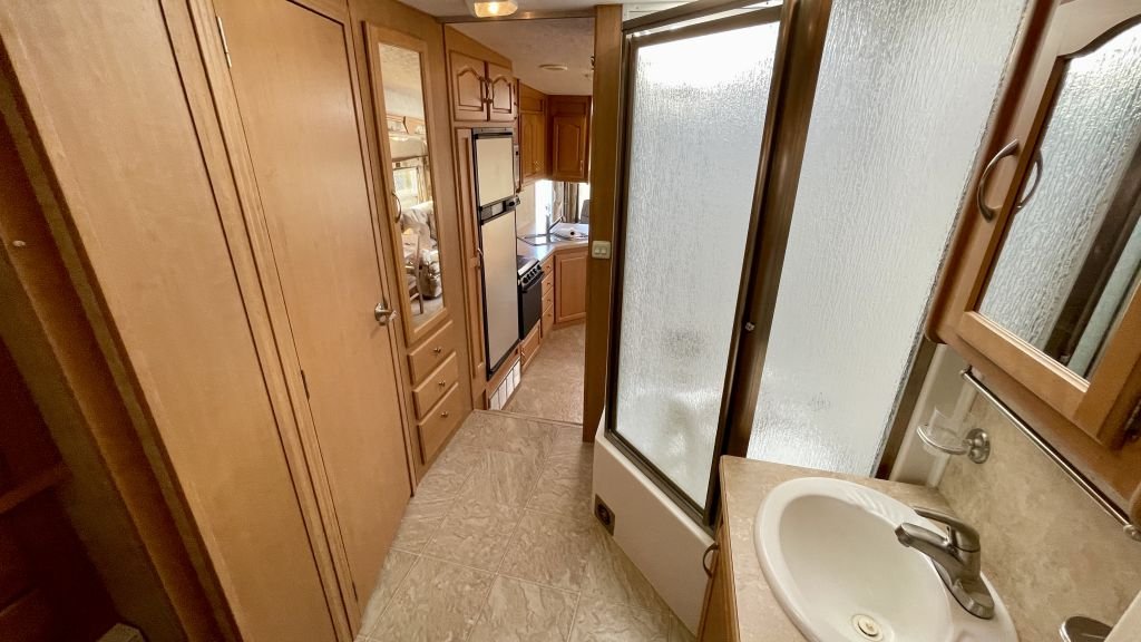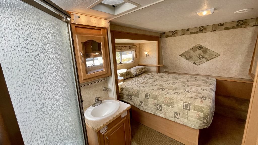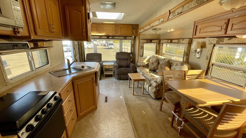 Has heated and enclosed underbelly, dual pane reflective windows with day & night shades, fiberglass front cap, roof air conditioner, 2 high volume fans, TV, DVD player, built in vacuum cleaner, 2 recliners, sofa bed, 8 Cu Ft propane & 110V fridge and freezer, 3 burner stove with large oven, awning and a load of goodies as shown in some of the pictures!