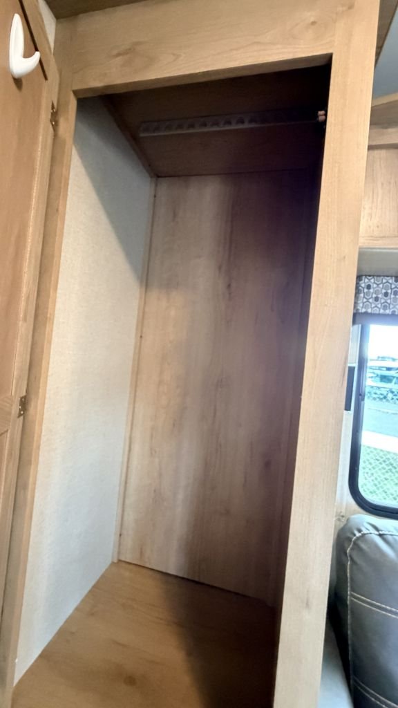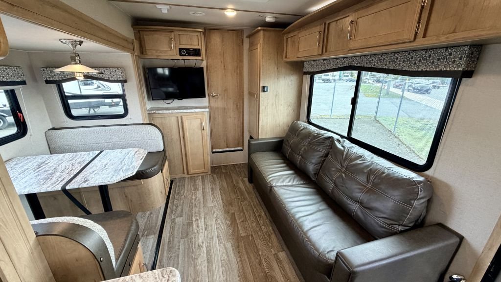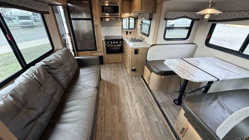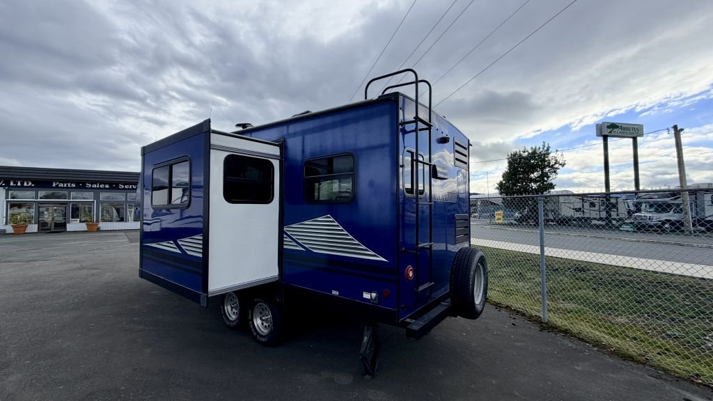 At just under 27’ long and 7’ wide this light weight, compact fifth wheel weighs 5,780 Lbs with a hitch weight of a 1060 Lbs. It has ducted roof air conditioner, sofa bed, power awning, power front jacks, microwave, oven, 2 door fridge/freezer, TV, radio with DVD player, outside speakers, rear ladder, outside shower and more….