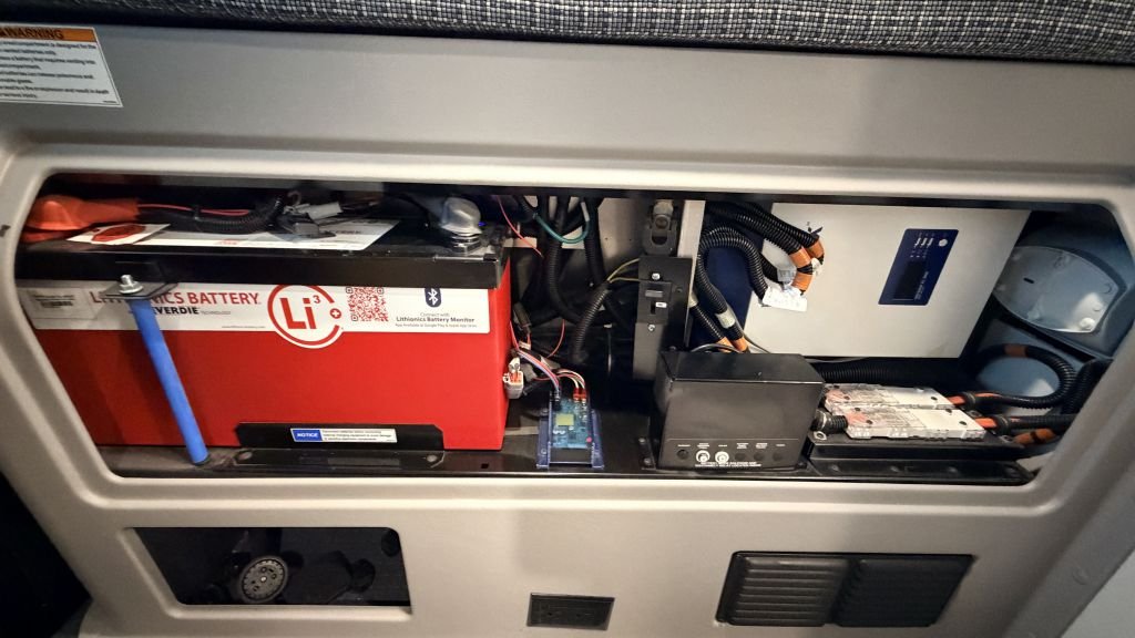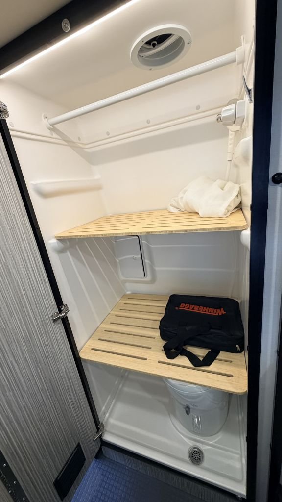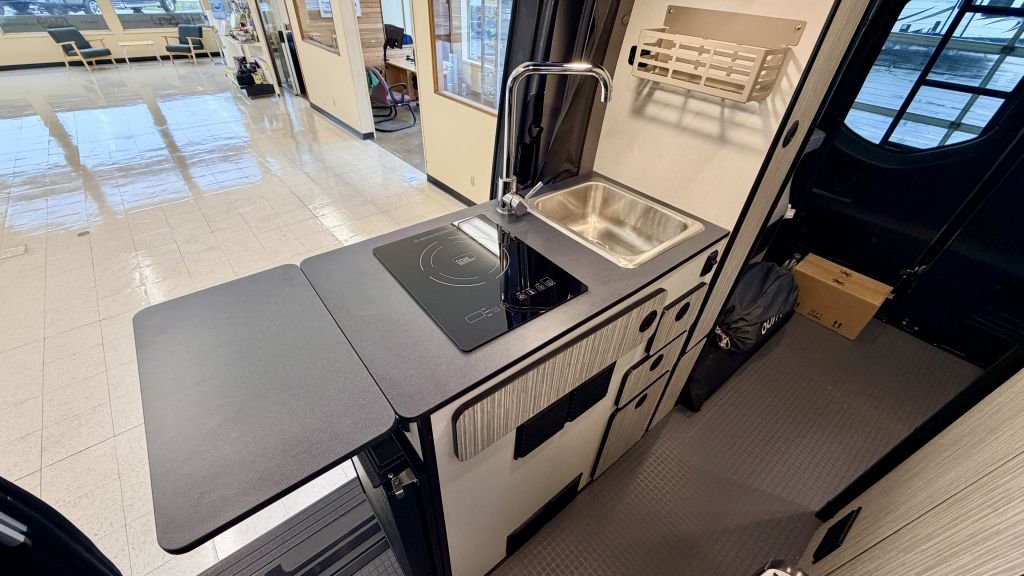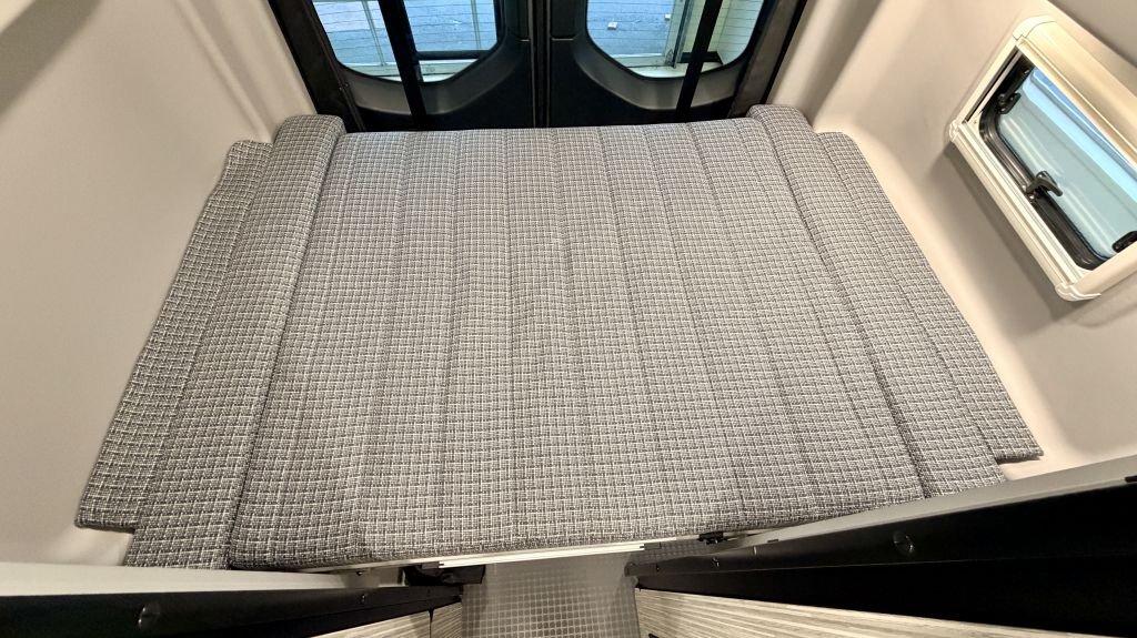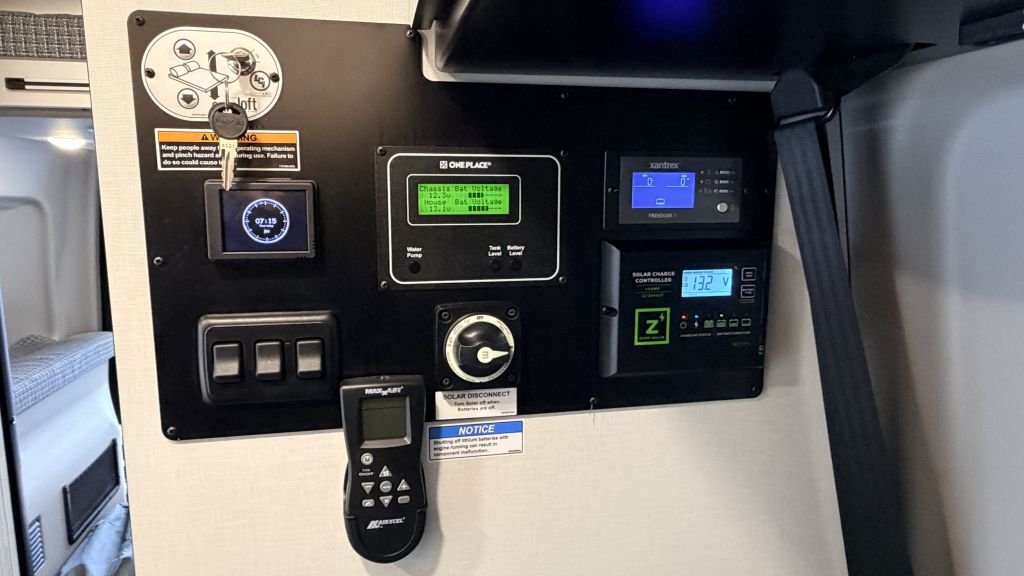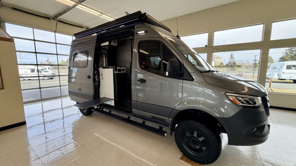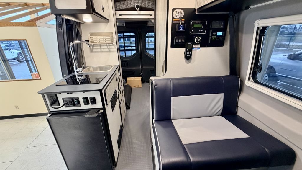 The 3M™ Thinsulate™ custom insulation, gap-free coverage, and high-tech honeycomb composite flooring ensure optimal temperature regulation, keeping you cozy in colder climates. This unit features a power lift bed (49” X 79”) that reveals a spacious gear garage for bikes or kayaks; it also has BF Goodrich® T/A® KO2 all-terrain tires, 320 Ah Lithium battery mated to 2 solar panels and a dedicated alternator plus a 2,000 W inverter, a diesel-powered hydronic heating system designed to provide heating and hot water in even the most adverse climates, a quiet & efficient Bluetooth® controlled air conditioner, front swivel seats, side and rear screen doors, swivel cassette toilet with flexible shower head, adjustable shelves and removable clothes rod, induction cooktop, counter extension, foldable exterior table, utility shower in the back storage area, adjustable and removable tie downs, power awning, side steps, roof access ladder and more….