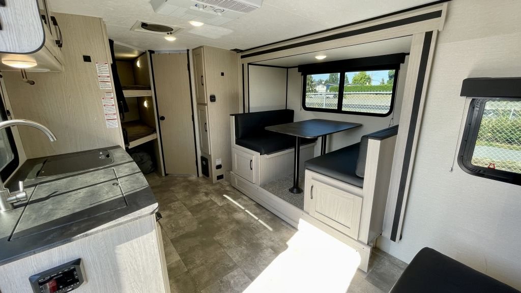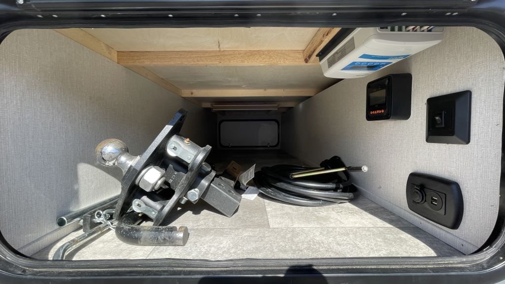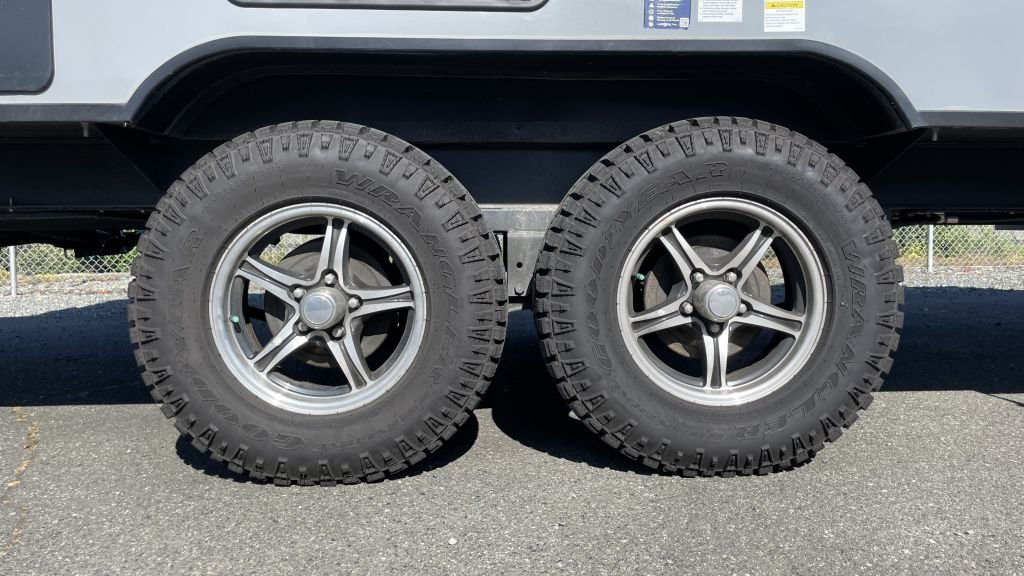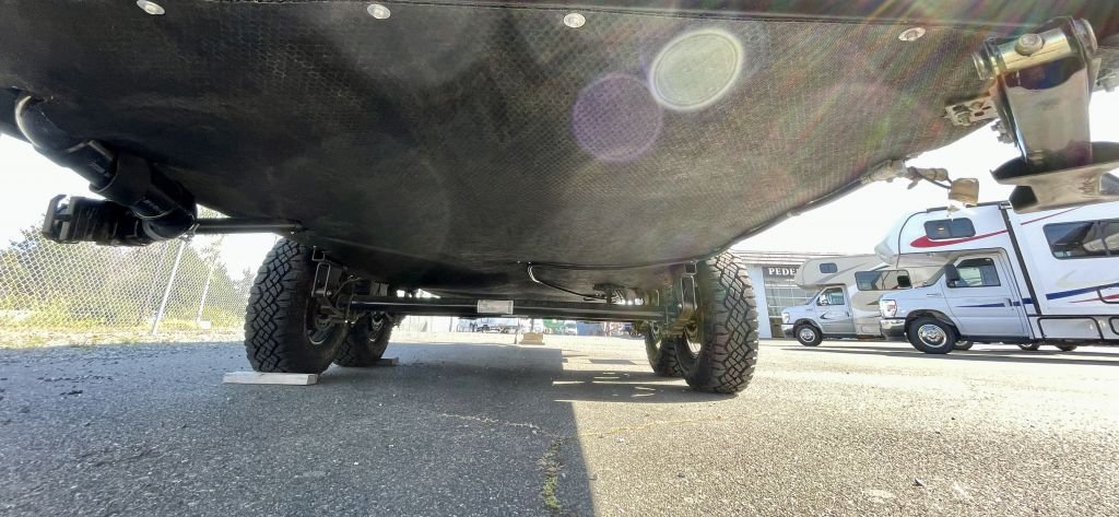 This trailer has Murphy Bed, Goodyear off road tires, heated and enclosed underbelly plus 12V tank heaters, EQ weight distribution hitch, RV cover, high volume fan, solar on roof, roof air conditioner, propane & 110V fridge & freezer, outside kitchen with stove and small fridge, Bluetooth enable radio with speakers inside and outside, outside shower, black water flush, front fibreglass cap, power awning with LED light strip, solid folding steps, tinted windows, microwave, 2 burner stove, large farm style sink with sink cover and more